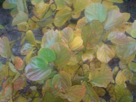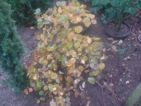 Het blad lijkt wel veel op beide genoemde planten, maar gezien de vorm/groeiwijze, ga ik toch voor Fothergilla major. Ook de vroege herfstkleur, duidt daar op.