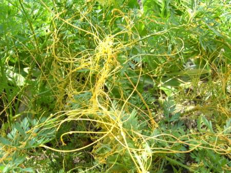 Tussen de wortelen is er een kruid aan het groeien dat zich tussen en rond de wortelbladeren slingert. Het maakt lange geel/oranje uitlopers, heeft geen bladeren en er komen kleine witte bloemen op (zie foto).