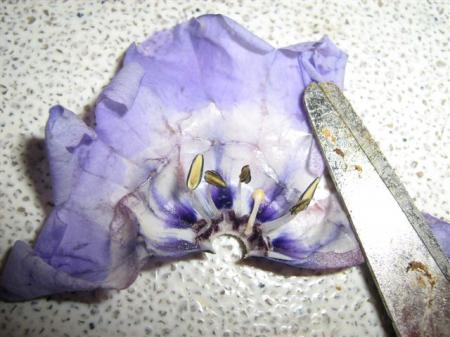 Zie foto. Het heeft zaaddozen , althans ik denk dat het zaaddozen zijn. en het heeft een lilakleurige bloem