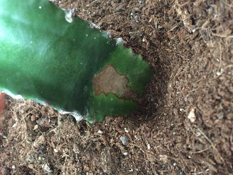 Ik heb gister een Euphorbiainfo-icon Acrurensis gekregen van zo’n 60 centimeter hoog. Het valt me op dat er zich onderaan de stam donkere plekken bevinden (zie foto). Is dit iets ernstigs? De bovenste laag van de potgrond is redelijk droog, de aarde onderin is vochtig (maar niet zeiknat).