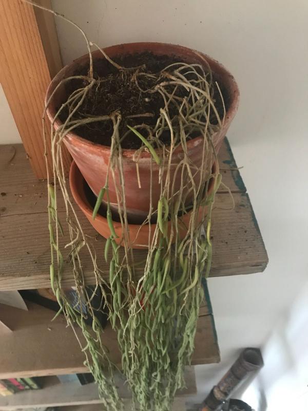Geen Rhipsalis, maar Hoya linearis. Deze plant is nogal gevoelig voor natte voeten. Het lijkt me dat de wortels verrot zijn, door ooit een keer te veel water. Mogelijk kun je de nog levende uiteinden opnieuw stekken.