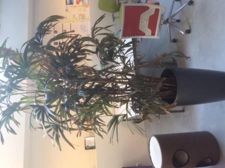 Hallo, Bij ons op kantoor staat een grote plant (zie foto) die we overgenomen hebben van de buren. We hebben hem al in een grotere pot gezet maar nog steeds worden de balderen bruin aan de uiteinden en sterven sommige takken helemaal. Ik weet niet wat voor plant het is maar hij krijgt ong 3-5 l water per week. Weet iemand wat ermee aan de hand kan zijn en hoe we hem weer gezond kunnen krijgen?