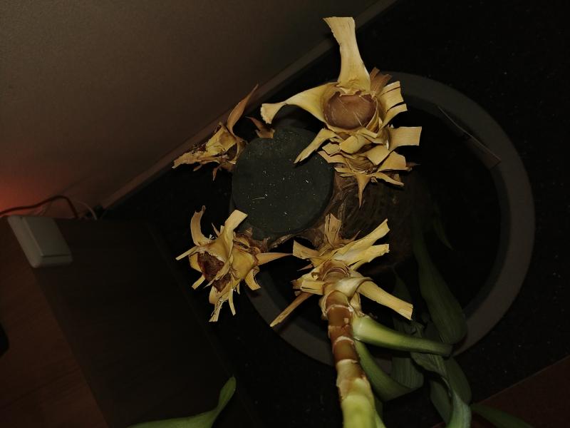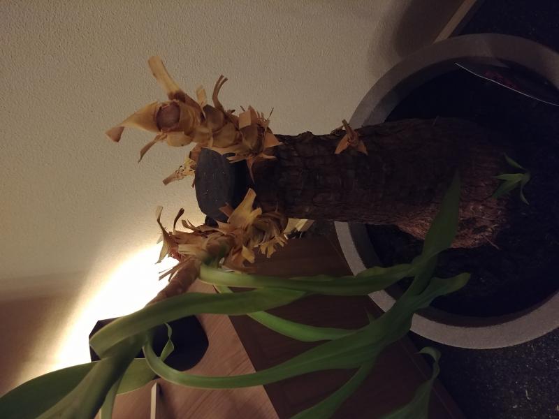 (Maya Tree) vandaag verpot aangezien twee van de drie stammen helemaal naar beneden hingen met dito bladeren. Alsof ze geknakt waren. Ik heb deze twee stammen gesnoeid, maar twijfel nu of dit de juiste beslissing was. De aanzet is helemaal bruin dus ging ervan uit dat ze rot waren. Hopelijk lopen de stammen weer uit. Kunnen jullie opheldering geven?