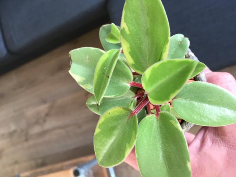 Ik heb dit plantje deze week gekocht en denk dat het een peperomia is maar welke? Misschien iets moeilijker te zien op de foto maar het blad heeft een licht bonte tekening en de stengels zijn rood.