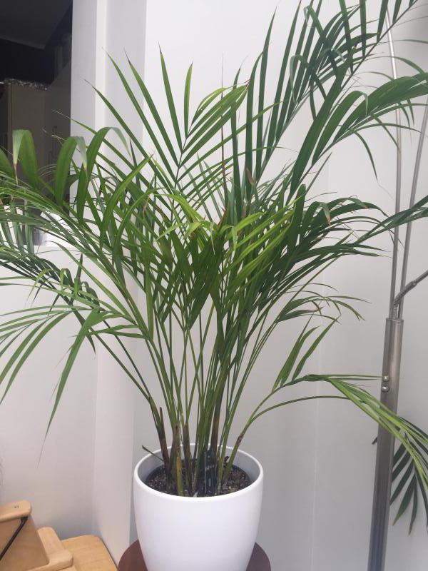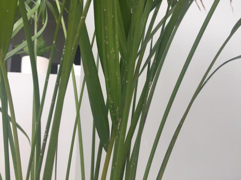 Deze Dypsis lutescens, goudpalm, vraagt een vochtige potkluit. Mogelijk is er te weinig water gegeven. De witte beestjes zijn wolluizen, een gevolg van de zwakke conditie en mogelijk een standplaats op de tocht.