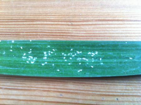 Een kleine week geleden heb ik een grote palm gekocht, volgens mij een Areca. Nu zag ik net allerlei witte bolletjes op de stammen en aan de onderkant van sommige bladeren Ik heb er zoveel mogelijk weggehaald met mijn nagel. Kan iemand mij vertellen wat dit is en wat ik hier aan kan doen?