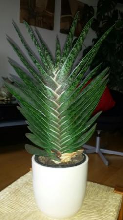 Bedankt voor jullie reacties. Gezondheidsproblemen hebben me helaas weggehouden van de PC, vandaar mijn late reactie. Ben er nog niet helemaal uit of het nu een Sanseveria- of een Aloë- variëteit is. Ik neig meer naar een Aloë toe, omdat mijn plant meer bolvormige bladeren heeft, terwijl de sanseveria meer holle bladeren heeft (zover ik het kan zien op diverse google afbeeldingen). De bloeiwijze komt overeen met die van de Aloë. Hoewel er ook veel overeenkomsten zijn met de bloei wijze van de Sanseveria. Als de plant weer gaat bloeien ga ik nogmaals de bloemsteel vergelijken met de plaatjes,nu moet ik in mijn geheugen graven. De plant op de foto is een nakomeling van de plant waar ik de vraag voor stelde. Aan de voet van de oude plant kwam een klein stekje, die heb ik los gepeuterd en in de aarde gezet. Deze is uitgegroeid tot de plant op de foto. Maar omdat de andere plant erg lelijk / scheef is geworden en er een herinnering aan de plant zit, wil ik deze wel graag behouden. vandaar mijn vraag. Voorlopig laat ik de plant maar (in al zijn lelijkheid) staan.
