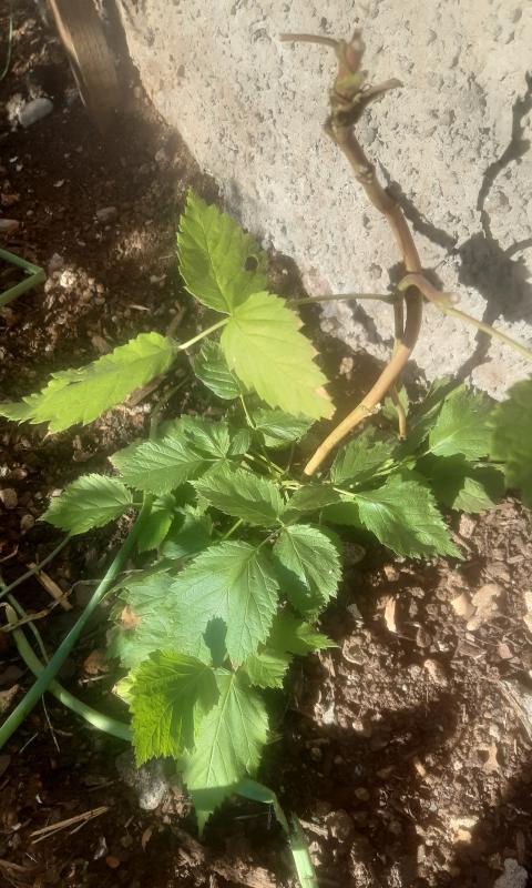 Vorige week framboos in volle grond gezet en op 30 cm hoogte gesnoeid. Na een terugval van tempetatuur overdag van 25 nasr 20 en s'nachts 14 graden, wordt het bovenste blad geel.
