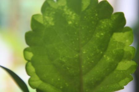 Op de eerste foto is te zien dat sommige delen van het blad donker kleuren. Het lijkt steeds plaats te vinden in een door nerven begrenst vlak dat vervolgens geheel donker wordt. Ook is een zeer regelmatig puntjes patroon waarneembaar, zie ook foto 3.