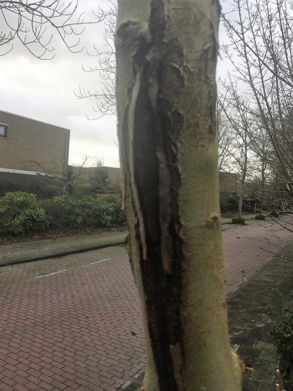 Ik heb op een houtwal een Es (spontane zaailing) staan. De boom heeft in het midden van de stam een langwerpige verdikking met bruinzwarte schade aan de bast. Is dit een kenmerk van de essntakstefte?