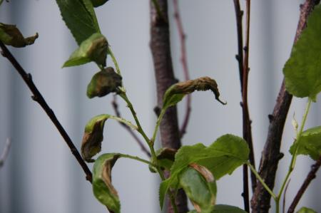 Wij hebben sinds een jaar of twee een abrikozenboompje in een pot. In de zomer staat hij buiten in de zon, in de winter binnen op zolder. Hij heeft het nooit echt goed gedaan, maar de laatste tijd gaat het in rap tempo steeds slechter. Er zitten geen zichtbare beestjes in. Hij maakt wel nieuwe scheuten met blaadjes er aan, maar die verdorren zeer snel en de scheuten zijn ook erg slap (zie foto's).