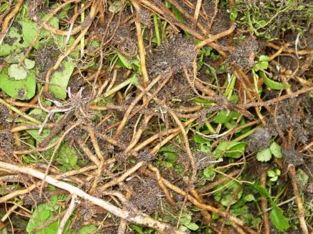 Kijk, dat geeft een ander licht op de zaak. Ik vind de eerste foto nl erg op knolletjes van speenkruid lijken, dus daarin heeft Carib dan gelijk. Maar die wortels erbij deed me denken aan de weegbreezonnebloem.Maar nu denk ik dat je met een ratjetoe aan planten bezig bent. De lange witte wortels kunnen van haagwinde zijn, maar ook zevenblad heeft in het begin lange witte wortels, die later naar bruin verkleuren. Een foto met blad maakt het allemaal duidelijker.