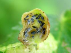 In mijn tuin staat een boom, ik denk een esdoorn. Op het blad zitten allemaal 'bolletjes' gegroeid. Hierin lijken kleine lichtgrijze beestjes te zitten. Wie weet wat dit is, en vooral wat ik eraan kan doen. De hele boom zit ermee vol!
