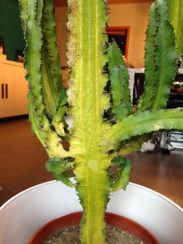 heb ik al twee jaar en heeft altijd binnen gestaan. Één keer per maand krijgt hij water en er zijn gaten onderaan de pot. Hij staat op een plaats met redelijk zonlicht. Sinds drie weken begon de ene stek te rotten en deze heb ik afgedaan en proberen te redden wat er te redden valt. De tweede stek bleef mooi tot vorige week deze nu geel begint te zien en enkele zijstekken slapper beginnen worden. Wat kan dit zijn?!