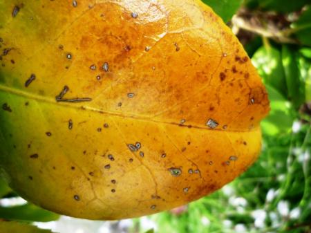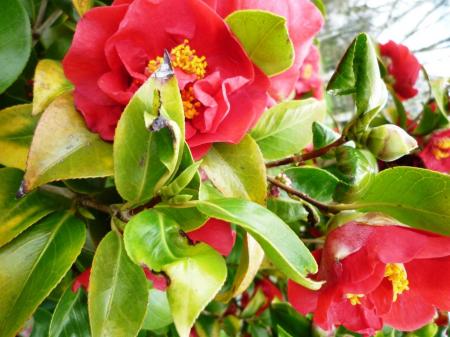 Al jaren staat hij omstreeks deze tijd te stralen, maar deze keer gaat er iets helemaal verkeerd. De bloei zit er nog wel in maar met het blad gaat het verkeerd. De verkleuring begon ergens in de nazomer. Eerst dacht ik dat dit het begin was van de jaarlijkse geringe bladval. Maar het is dus een vraat of een ziekte. Kent iemand dit probleem en weet wat er aan te doen is? Ik stuur een aantal detail-foto's mee en een beeld van een rododendron die naast de camelia staat er die er ook niet fris uitziet.