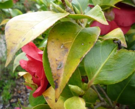 afgelopen jaar last heeft gehad van droogte in combinatie met felle zonneschijn. Als Camellia te veel zon krijgt wordt het blad geelachtig. Beste plek voor Camellia is op het noordwesten of in gefilterd zonlicht.