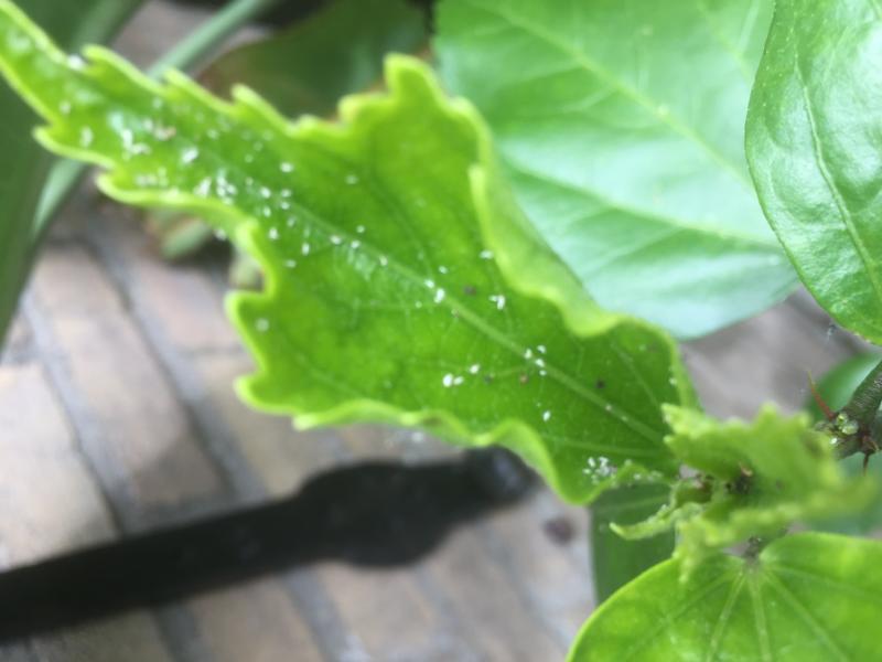 Misvormingen door luis, wat aan de jonge plantendelen zuigt. Na uitgroei krijg je dit beeld.