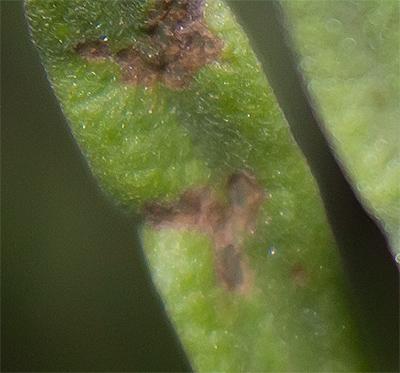 Nog een foto van de vraatschade (zo lijkt het). Komt dit wel door de sprinkhaan? Als ik zo lees wat sprinkhanen in Nederland zoals eten, is dat vooral kleine insecten.