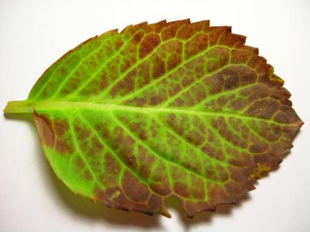 Sinds enkele dagen krijgen alle bladeren rode vlekken tussen de nerven en sterven vervolgens af. Ook zijn ze wat aangevreten langs de randen.