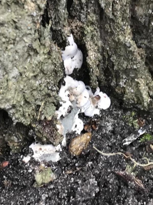 Antarctica. Een geweldig mooie boom. Sinds een paar jaar is de groei van de boom helaas wat minder en laat ie al vroeg bladverlies zien. Soms al einde zomer. Nu zien we aan de voet van de boom op meerdere plaatsen iets wits, iets wasachtig groeien. Zie bijgaande foto. Weet iemand wat het is en in hoeverre het gevaarlijk is voor de boom?