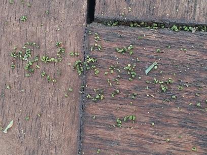 De groene korreltjes die zo massaal uit de boom vallen vind ik nog het meest bizarre. De korreltjes lossen niet op in water. Het zijn geen kleine beestjes, ik denk dat het ontlasting of vervelling/cocon van insecten is.