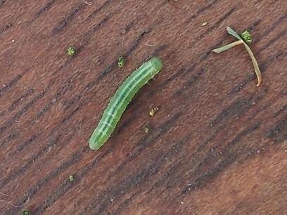 Ook nu heeft mijn Larix weer wat pluisjes aan de naalden zitten, maar vallen er ook heel veel groene korreltjes uit de boom. Het is eigenlijk voor het eerst dat het mij zo erg opvalt. Verder vallen er af en toe ook kleine groene rupsjes uit. Een paar maanden geleden, toen we net uit de winter kwamen, heb ik ook rupsen opgemerkt die zich via een zijden draad aan het verspreiden waren.