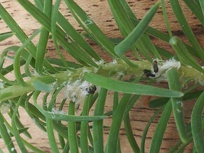 Bij de witte pluisjes denk ik aan rupsen, bladluizen of spint...