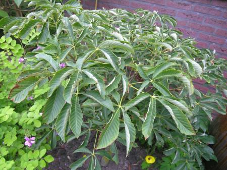 Ik heb onlangs deze kastanje variëteit geplant. Vermoedelijk stond deze oudere plant al jaren op de kwekerij in dezelfde pot zonder dat er veel aandacht aan werd besteed. De oorzaak van het omgekrulde blad is mij niet duidelijk: watergebrek is het waarschijnlijk niet. Is dit misschien een bekend verschijnsel bij deze soort? Verdwijnt het wellicht als de plant eenmaal is aangepast?