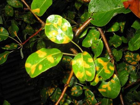Oranjerode grote bladvlekken op de perenboombladeren. Later verschijnen opvallende bruine vergroeiingen en uiteindelijk vallen de aangetaste bladeren vroegtijdig af. Juniperus