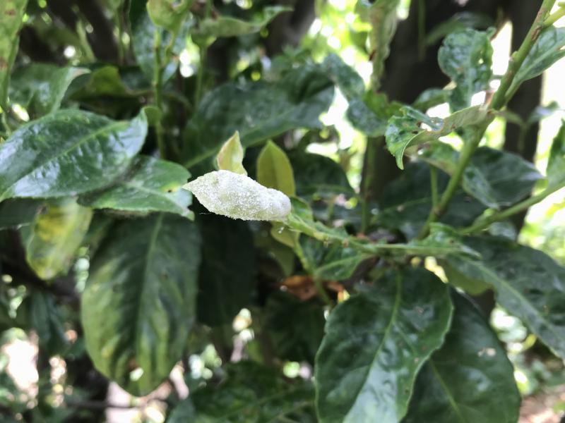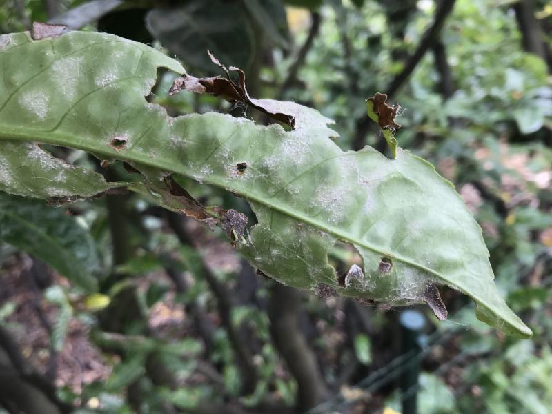 Onze paplaurier was meters hoog vorig jaar. Die hebben we gesnoeid, en begon opnieuw aardig te schieten. Enkele maanden geleden begonnen blaadjes te krullen, bruin te worden ... Ik dacht dat het met de droogte te maken had. We wonen hier nog maar 2 jaar, en daarvoor nooit een tuin gehad (vandaar misschien de onwetendheid). Nu las ik vandaag iets over meeldauw. Ik heb zitten zoeken en denk dat het daadwerkelijk over meeldauw gaat. Zie foto's.
