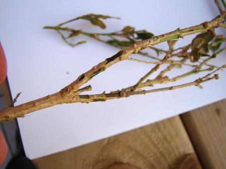 begint de aantasting, daarna wordt het hele blad bruin.De takken hebben dan zwarte