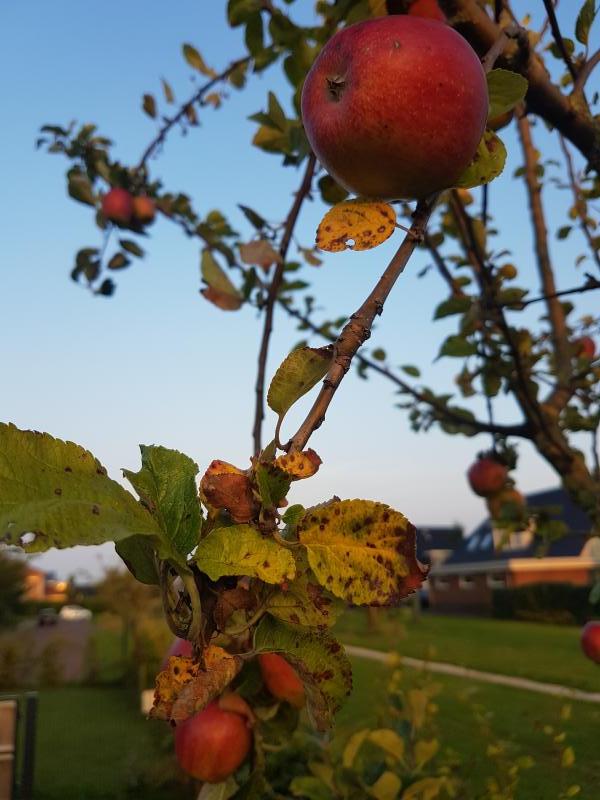 Bij een aantal planten in de tuin, ontstaan gele bladen met bruine vlekken. Dit is in onze appelboom.