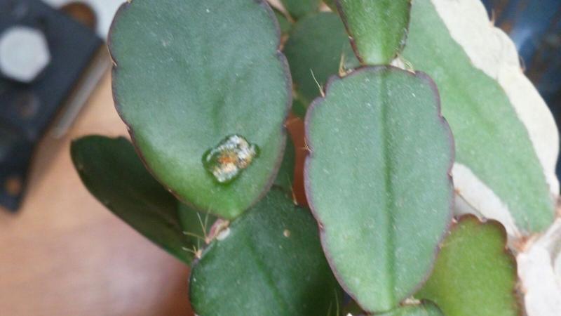 Ik heb sinds een tijdje vreemde plekken in mijn lidcactus. Heb hem al verpot en hij krijgt regelmatig voeding. Wie weet wat het is en hoe hij ervan af komt?