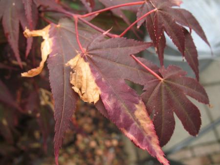 Mijn Japanse Esdoorn heeft bladeren die lelijk aan het verkleuren zijn of misschien wel erger. Herkend iemand wat dit is en wat ik er tegen zou kunnen doen? Alvast mijn dank voor uw reactie(s)