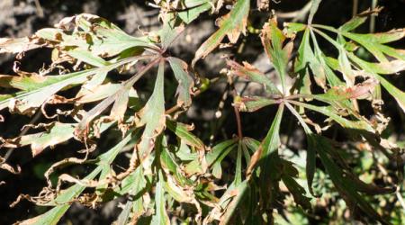 De Japanse esdoorn heeft wat lijkt op schroeiplekken op de blaadjes en de blaadjes op de krenteboompje worden niet egaal donker groen en sommige hebben witte plekjes.