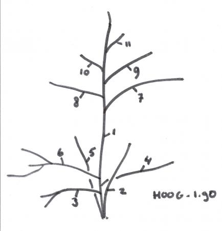 Ruim twee jaar geleden deden wij voor de lol een zaadje van een biologische appel in een potje met aarde. Nu is dit zaadje uitgegroeid tot een jong boompje en hebben wij hem in de volkstuin geplaatst en doet het erg goed. Geheel tegen onze verwachting is lijkt dit boompje serieuze plannen te hebben om een echte appelboom te worden en vraag ik uw advies. Hoe deze jongeling te snoeien zodat de boom een boom kan worden. Ik heb een tekening gemaakt en de takken die nu aanwezig zijn genummerd en hoop dat leden van dit forum hun expertise willen delen en ons vertellen welke takken we waar moeten snoeien. Vast ontzettend bedankt voor uw meedenken en advies.
