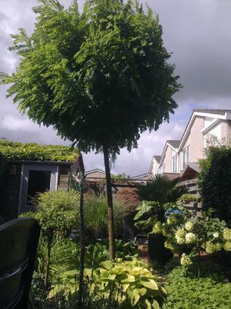 Na de heftige storm van vorige week is onze bolacacia ver uit het lood komen te staan. Ik ga in ieder geval proberen 3 boompalen in een driehoek te plaatsen, alleen tot welke lengte onder de knot moeten die palen dan komen, en is het anders mogelijk om hem nu al helemaal te knotten?