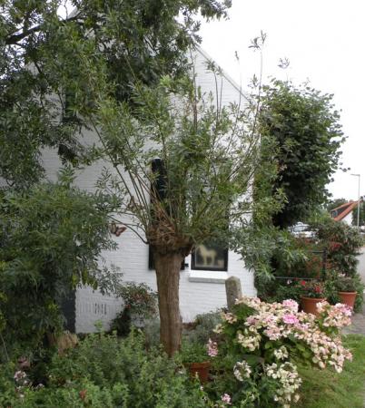 Ik heb ruim 10 jaar geleden naast mijn huis een wilgentak geplant . Hij is om het jaar ('s winters) geknot en de laatste jaren waren de takken dan precies dik genoeg voor de open haard . Nu zou hij komende winter weer aan de beurt moeten zijn om te knotten , maar hij ziet er treurig uit ,de takken zijn nauwelijks gegroeid en er zijn er zelfs die afgestorven zijn , die heb ik er inmiddels uitgehaald .