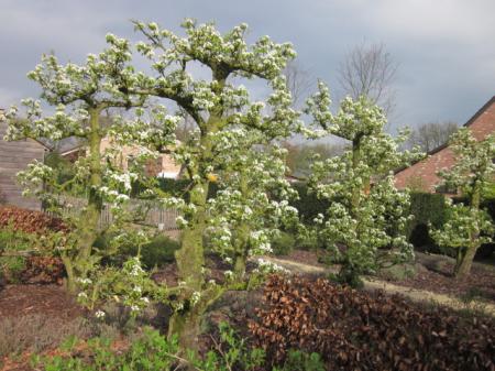 dit jaar hebben we terug bloemen met blaadjes, hebben we dan terug minder peren en ligt het daaraan of aan iets anders; het zijn conference perenbomen met onderstam(weet niet juist welke) en ze zijn geleid in een palmet