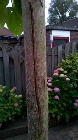 die aan de verwelkingsziekte ten onder is gegaan. Heeft dit er iets mee te maken? De barst is bijna 1 cm diep. Volgens mij ook groter/dieper dan vorig jaar.