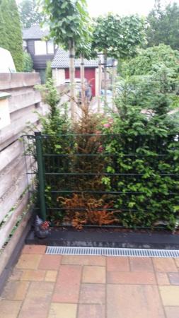 Vorig najaar is de beukenhaag vervangen door taxus. De meeste planten zijn goed aangeslagen, maar eentje staat er wat zielig en bruin bij. Moet deze plant worden vervangen? Wat zou de oorzaak kunnen zijn?