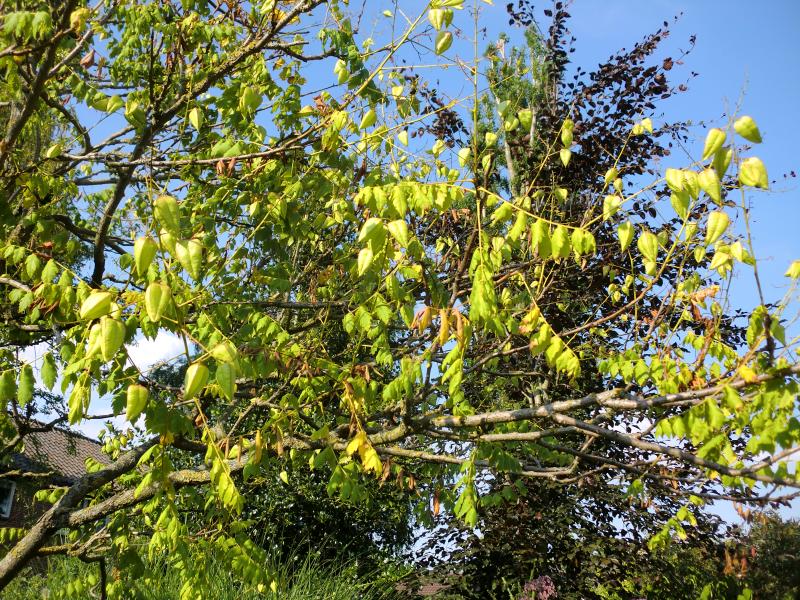 Ik heb sinds 4 jaar deze boom aangepland. Eerste jaar zat er een goede groei in, alle jaren daarop groeit de boom maar nauwelijks en het lijkt dat deze geen vocht opneemt, maar dat lijkt mij onwaarschijnlijk. Rondom de kluit heb ik zeker 50 cm vrij gehouden, en verder staat er geen zware beplaniting bij de voet. Boom bloeit ook maar nauwlijks, maakt wel zaden aan, zie foto. Iemand een idee wat dit probleem kan zijn.