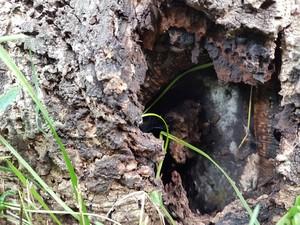 Gisteren ontdekte ik ter hoogte van het maaiveld een aantal rotte plekken. De plek die ik heb gefotografeerd zat vol met pissebedden en zelfs een kleine kikker. Ik wil de boom niet kappen, maar ben wel een beetje bang dat de boom omvalt. Zeker gezien de scheefstand. Als de boom omvalt, komt deze boven op de schuur van de buren terecht.