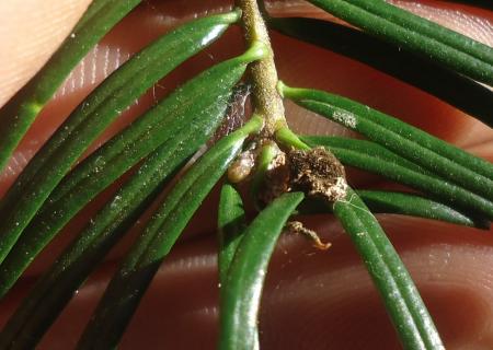 Aan het eindpunt van de twijg staat er een knop van waaruit de nieuwe twijgen na de winter zullen uitlopen. Naast die knop, of een centimeter lager staan er nog een of twee knoppen, van waaruit de zijtakken uitlopen. Als je het niet goed ziet, trek je de naalden aan het einde van de twijg uit zodat je een kale twijg overhoudt, waardoor je de knoppen goed kan zien.