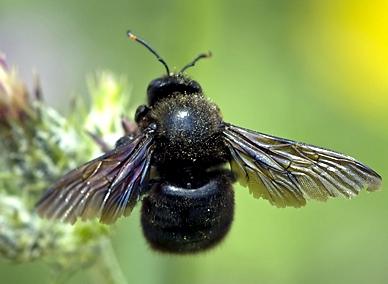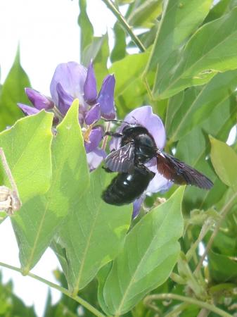 De blauwzwarte houtbij doet zich nog te goed aan de nabloei van de Wisteria.Is dit een mannetje of een vrouwtje?