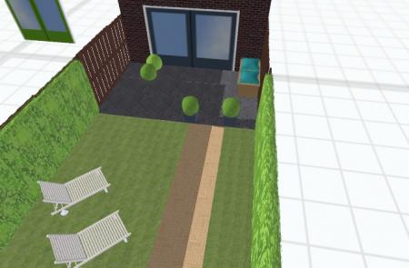 Hey, ik ben Joff en heb enkele maanden terug een oud rijhuisje gekocht. Ik ben bezig met dit huisje te renoveren en alles zeer strak en modern in te richten. Uiteraard hoort het aanpakken van de tuin hier ook bij. Gezien zowel ik als mijn vriendin ontzettende levensgenieters zijn en wij graag zo veel mogelijk vrije tijd over hebben en dus niet graag veel in de tuin werken (vermoedelijk in tegenstelling tot de meeste op dit forum :-) ) wil ik de tuin zo onderhoudarm mogelijk inrichten. Ik heb nu via een programmatje een schets gemaakt van hoe mijn vriendin en ik de tuin graag zouden hebben. Ik vind het zelf erg geslaagd eigenlijk :-). Maar nu moet ik dit alles natuurlijk nog in de praktijk omzetten. Belangrijk om weten is dat mijn vriendin zeer allergisch is aan zowat alle stuifmeel. Om deze reden zouden wij willen opteren om in plaats van echt gras voor kunstgras te gaan.
