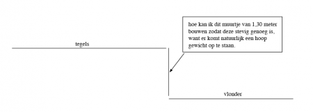 Ik heb een vraag over hoe ik iets moet bouwen in de tuin. Ik zal in het kort even uitleggen wat de situatie is. Wij hebben een tuin van 13m lang, wonen aan het water. Nu wil ik de tuin gaan aanpakken. De eerste 7 meter moeten gewoon tegels worden, niks bijzonders. Na deze 7 meter gaat de tuin 1,30m omlaag en daar begint een vlonder van 6x6m. Die 1,30m moet recht omlaag gaan. Nu komt mijn vraag. Hoe kan ik het beste een afscheiding of muurtje maken die ongeveer 1,30m hoog is en stevig genoeg? Ik voeg ook een schets toe om het wat beter toe te lichten.