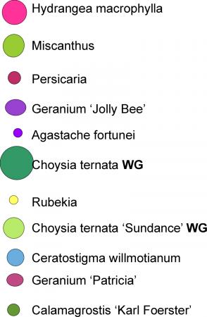willmotiana (loodkruid): heestertje bloei vanaf juli met echte blauwe bloemetjes tot half november, de bladeren verkleuren mooi in het naseizoen, in maart terug snoeien.
