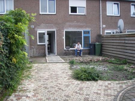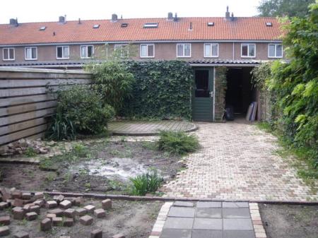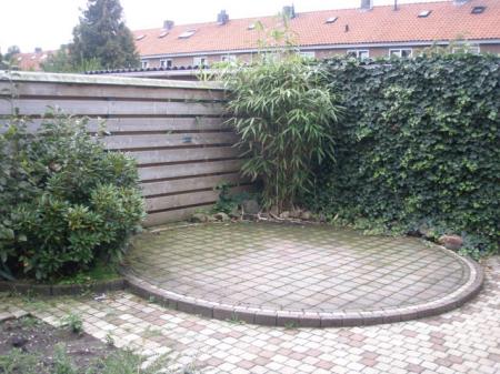 Een rond terrasje, waar ik mijn kippetjes tussen de twee struiken en de bamboo in wil zetten (nog niet zeker) dan haal ik de halve ronding eruit.. maar misschien is dit zonde dus ik moet dit nog bekijken.