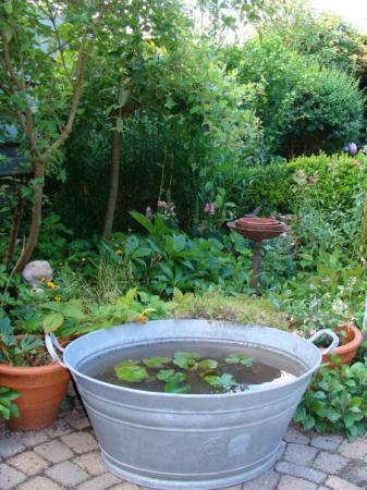 Ik vind waterplanten prachtig, maar ik wil geen vijver of vissen in de tuin. Dus ik ging op internet rond kijken en vond onderstaande foto. Dat leek mij een geweldig idee! Een teil gevuld met water en volzetten met waterplanten. Je kunt ook ipv een teil andere bakken, potten of iets dergelijks gebruiken hiervoor die waterdicht zijn. Je kunt zelfs zoiets ingraven net als een vijver, maar ik vond zoals op de foto al erg mooi. Misschien dat er meer mensen dit een leuk idee vinden dacht ik. Dus vandaar dat ik het even hier neer zet.